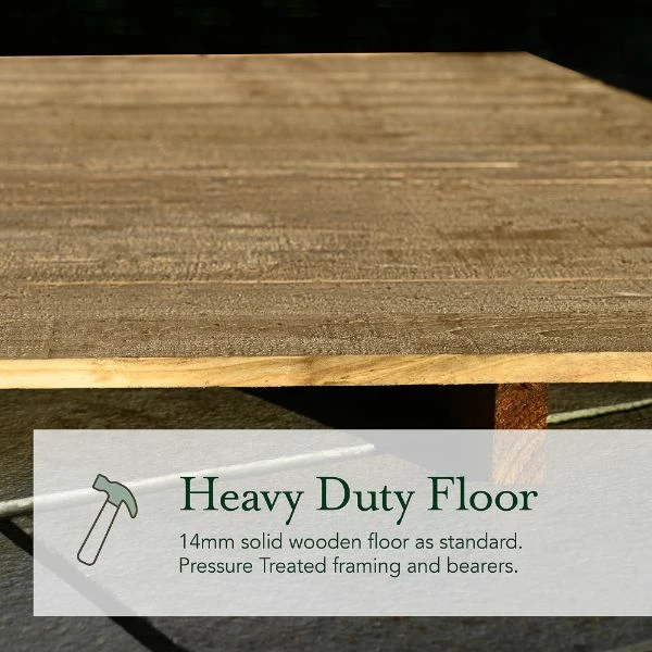 - 14mm solid wood floor as standard, much stronger than standard OSB shed floors