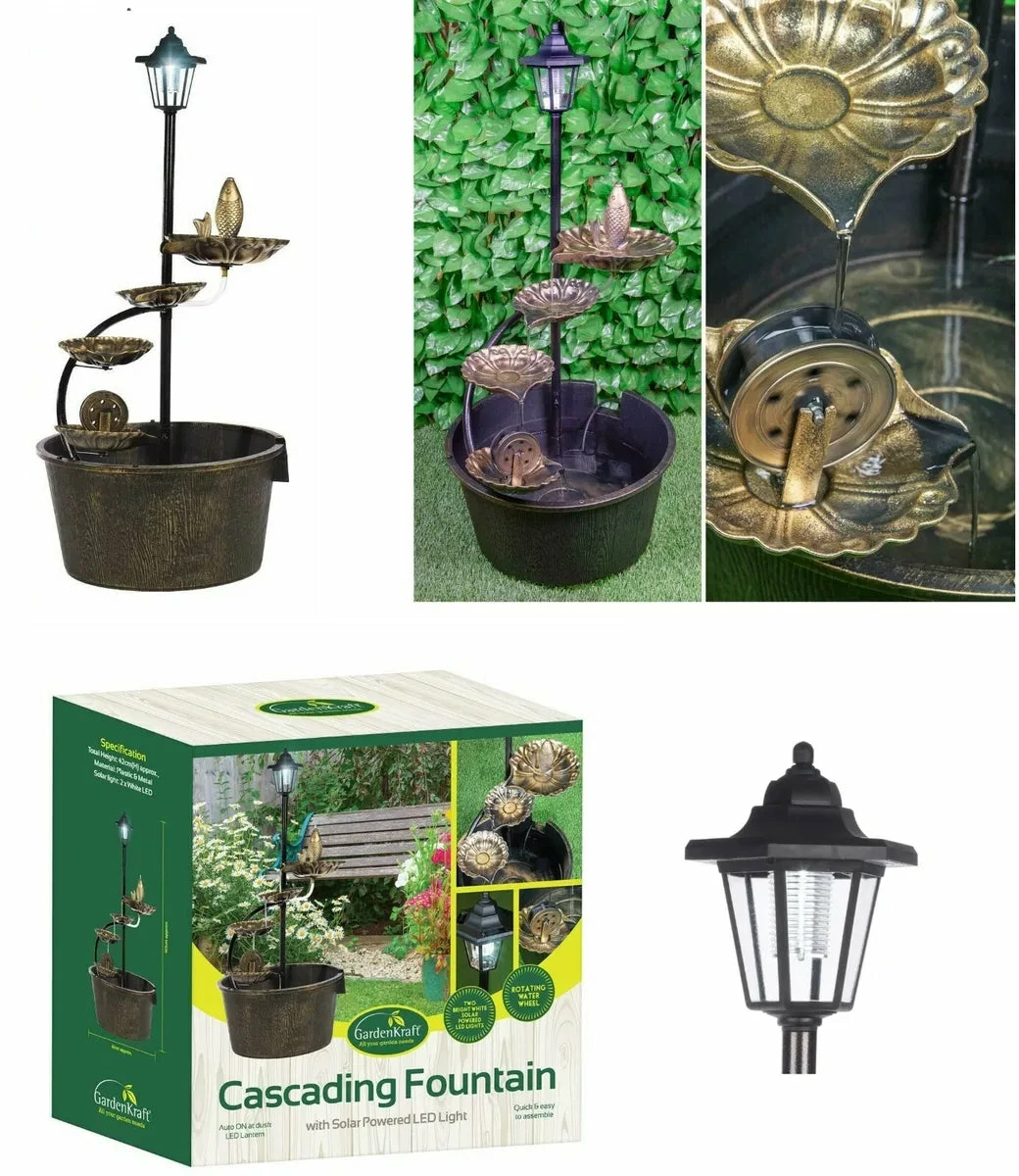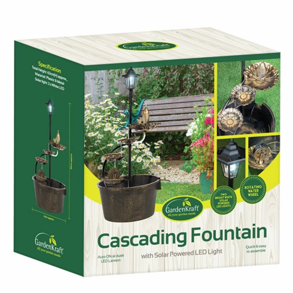 This unique garden feature will bring peace and tranquillity into every outdoor space it graces. A free-flowing cascading water feature for the ages, this water fountain pumps water from the mouth of a coy fish, down the lotus leaves, onto the spinning water wheel and finishing up in the classic wood effect barrel. The garden water feature also comes equipped with a solar powered lamp post, which harnesses the suns natural energy throughout the day and then automatically illuminates the night sky at dusk. The water feature is manufactured from a mixture of weatherproof plastic and iron, allowing it to be left outside year-round without any compromise to quality. The top of the garden features tops 90cm and the base is 41cm in diameter making the whole unit freestanding and secure. Water features are a fantastic way to attract more nature into outdoor spaces and offer some tranquillity in a relaxing outdoor space.