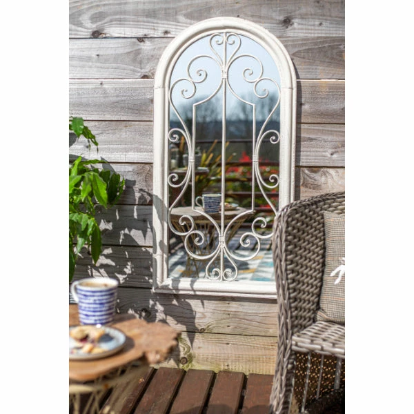 An ornate mirror with a delicate scrolled embellishment, our Scrolled Arch comes finished in antique white. Its elegant aesthetic will complement a more traditional style space to bring extra light, space and alluring reflections to your garden.