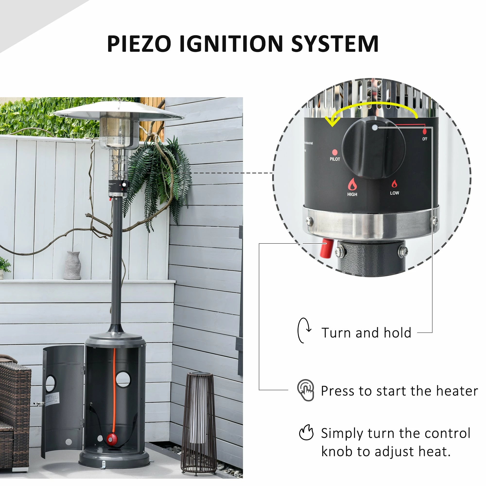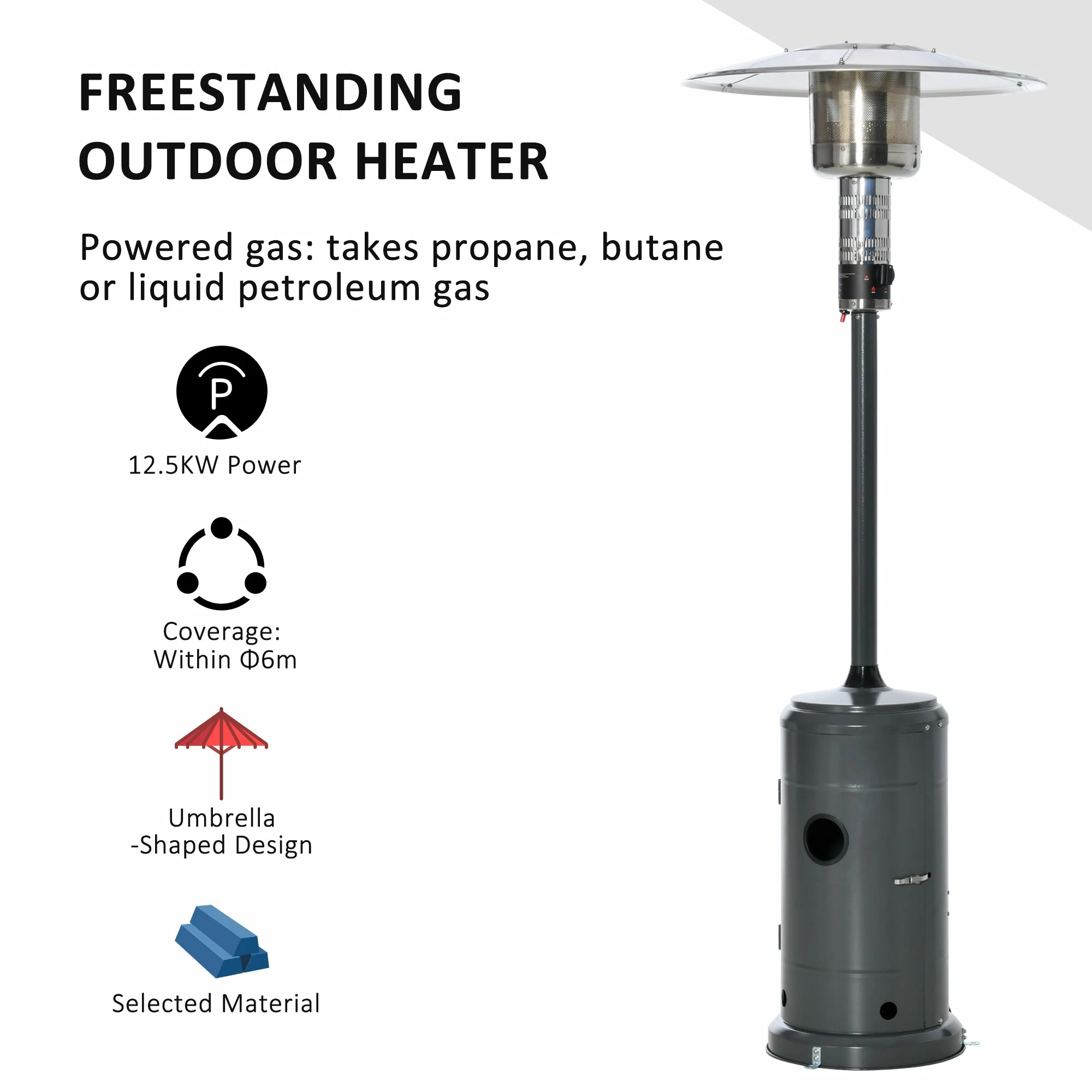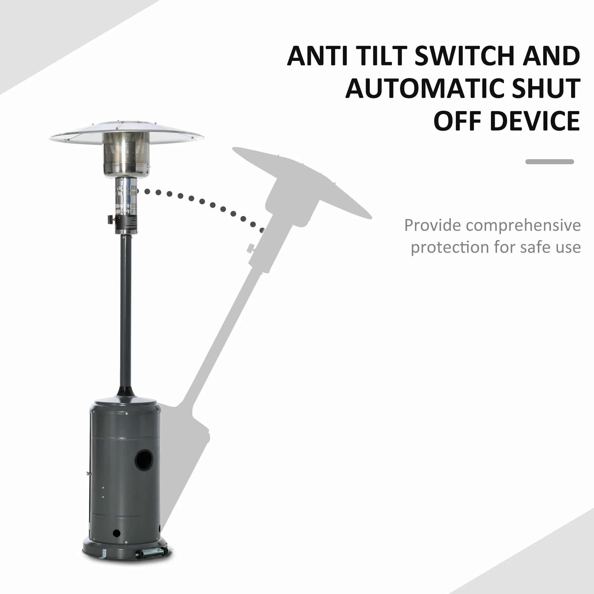 Bring warmth outdoors when the temperature drops with this freestanding patio heater from Outsunny. Made from solid metal and stainless steel for stability and durability. Powered by either propane, butane, or liquid petroleum gas, the heat can be adjusted between high and low by the knob, giving you greater control over how warm you want to be. With two wheels for easy movement, an anti-tilt switch and automatic safety shut-off ensure safe use. It will make you love your outdoors even more.