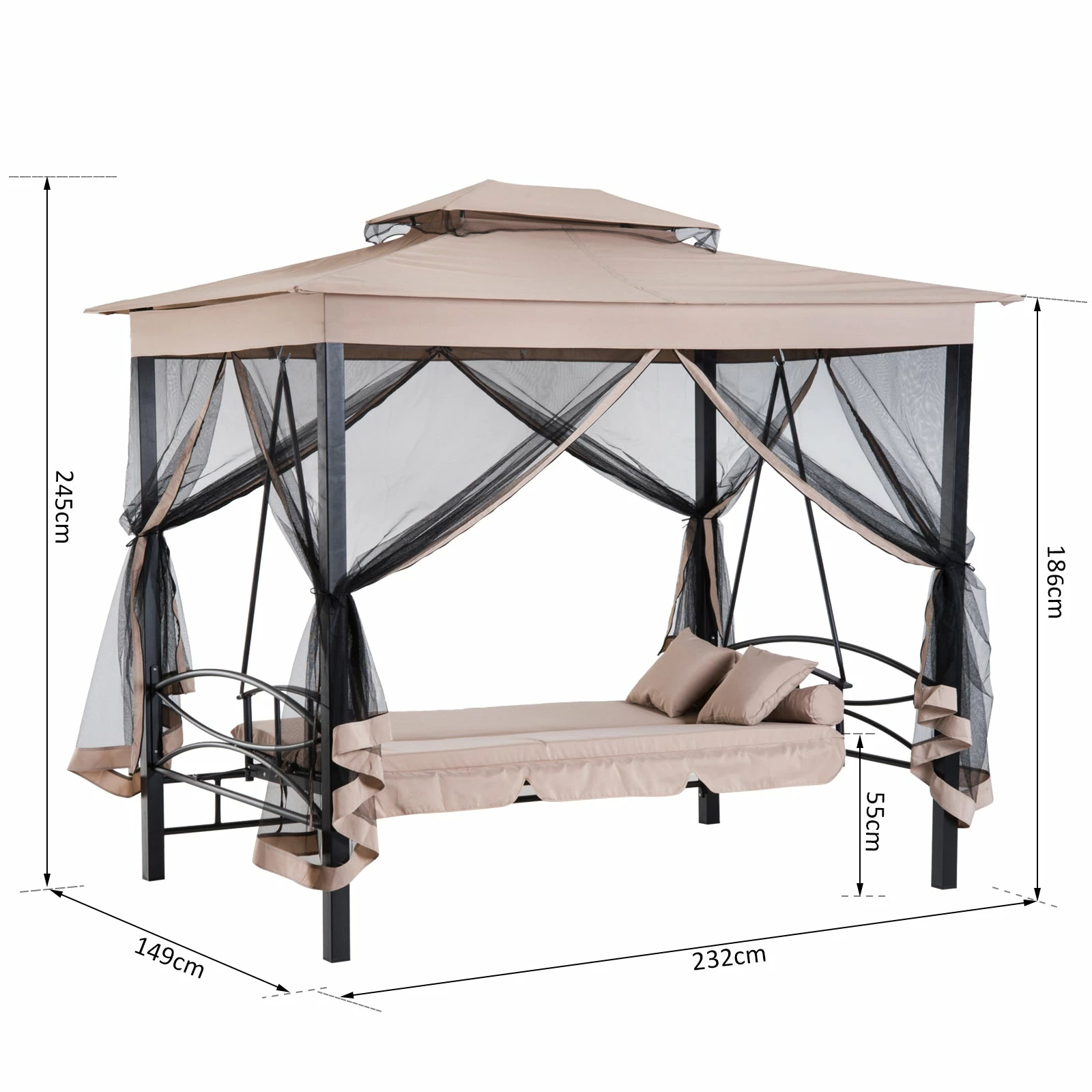 The 3 seaters multi-functional outdoor swing chair can be converted to a single bed in seconds. With cushions, two soft pillows and two neck rolls, swing seat with canopy offers optimal comfort whether you are sitting or lounging. The removable zippered mesh curtains on all sides protect you against mosquitoes and allow for fluid air circulation. The metal garden swing bench with a 300kg weight capacity allows you to relax on the comfortable swing chair hammock with your loved ones.
