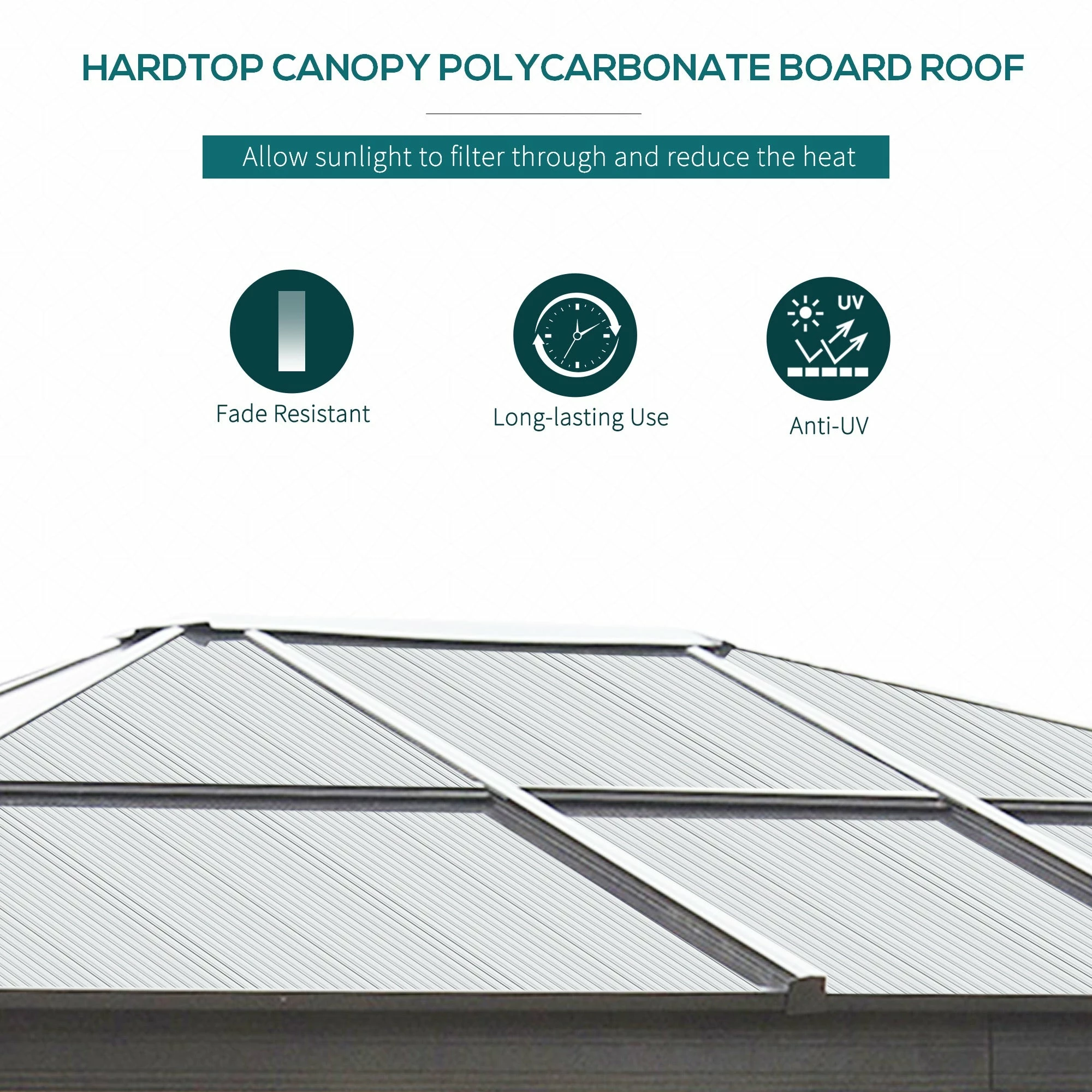 Add an elegant touch to any outdoor space with this Outsunny 3m x 4m gazebo with netting, a perfect sun shelter for any occasion! The polycarbonate roof is UV protection. Rust resistant aluminium for the frame makes it sturdy, formed into a spacious size – you can host plenty of people at once. Curtains create privacy, each with inner netting to shield you from annoying bugs and more. Life is meant to be enjoyed outdoors, so enjoy this hard roof gazebo in your own backyard space.