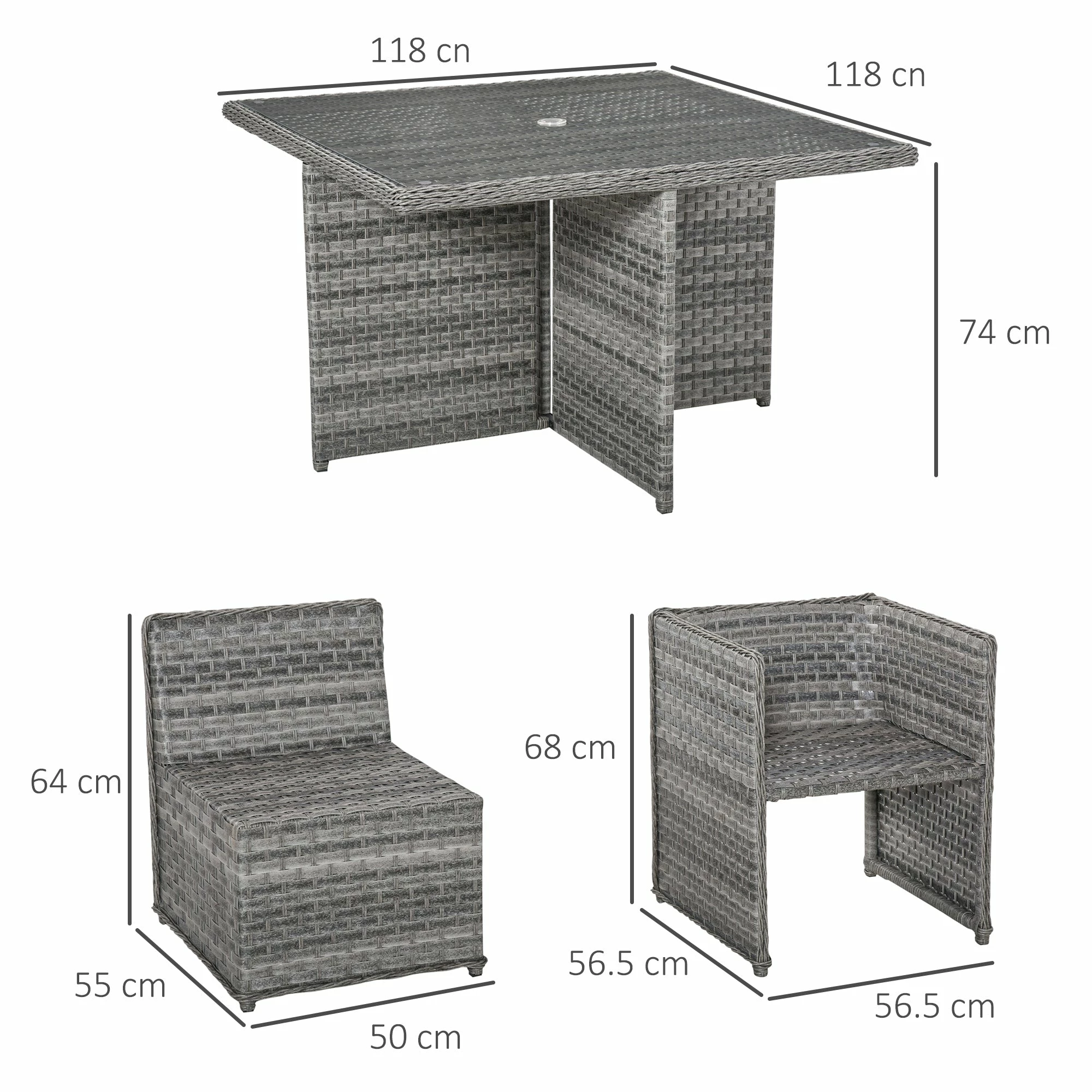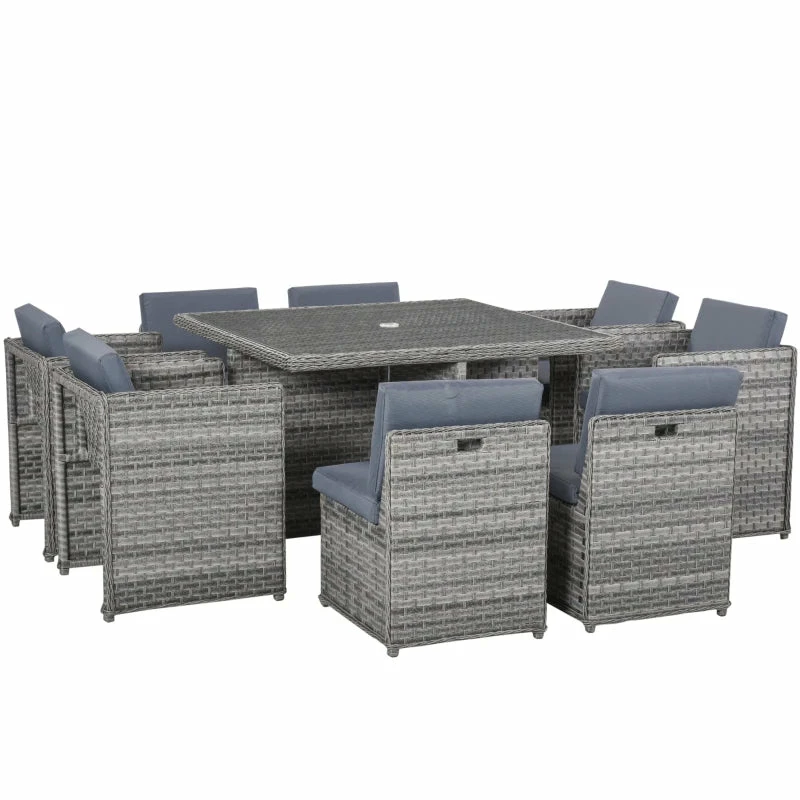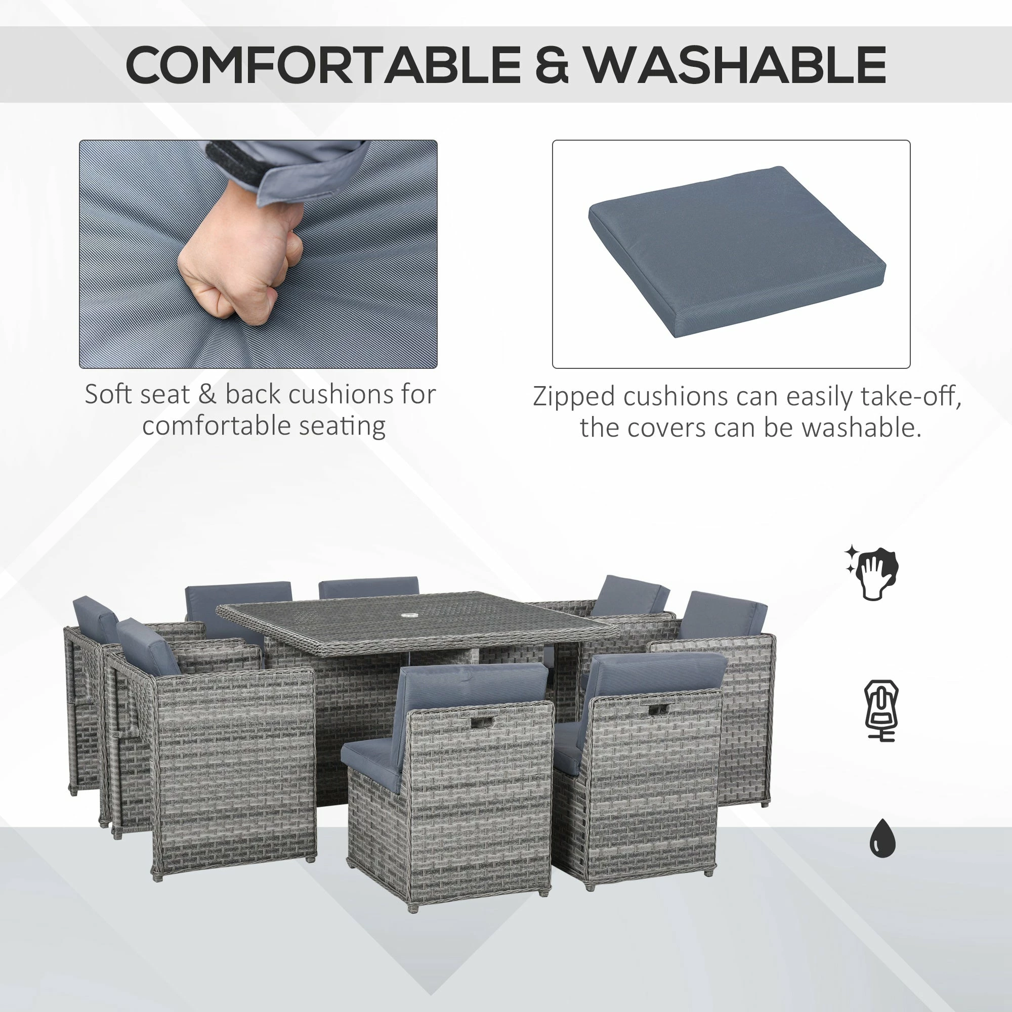 The nine-piece rattan garden dining set from Outsunny creates an inviting setting, ideal for garden and other outdoor areas. Using rust-resistant metal for a solid frame, PE wicker of the rattan cube dining sets is woven around for extra durability and weather resistance. The tempered glass table top of the corner rattan dining set is super easy to clean and adds a sophisticated look, with a handy parasol hole to keep you protected against the sun. Family get-togethers never looked so stylish.