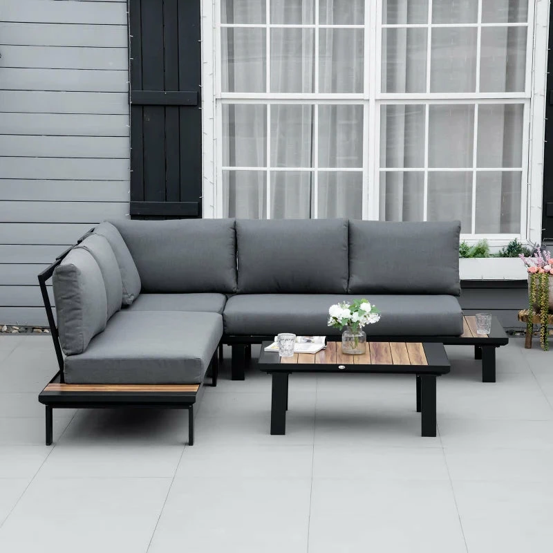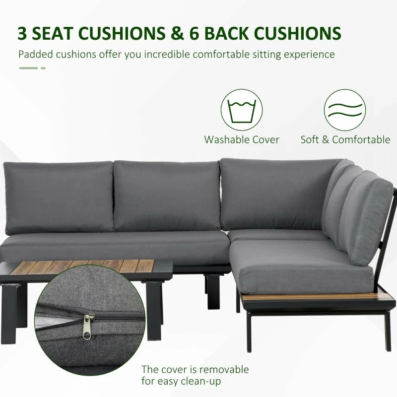Comfortable seating space with handy holding space at all angles – what more could you want? The aluminium garden furniture sets from Outsunny is formed of two sofas, a corner chairs and a coffee table to bring the whole family together. The aluminium frame of patio set is strong and supportive, with curved legs to keep balance. Back and seat cushions are easy to sink it for long periods. It’s finished with a spacious main table and two small surfaces on the end of the sofas.
