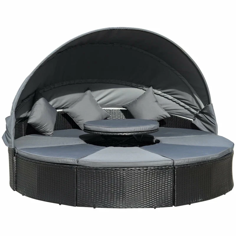 - Large outdoor bed formed of half-moon sofa, two quarter chairs and small round table