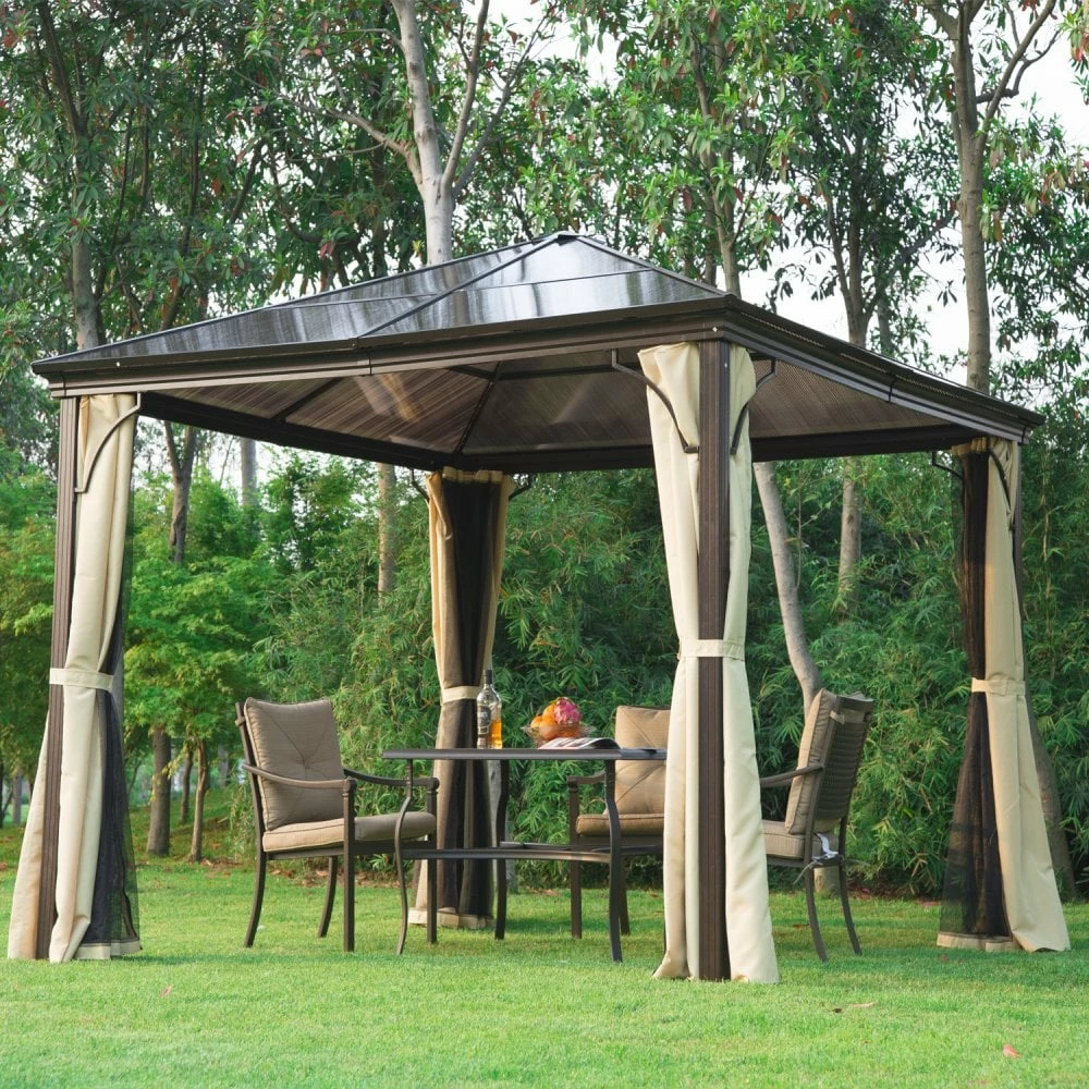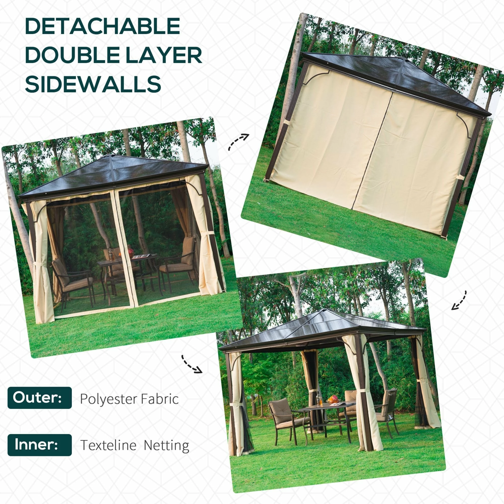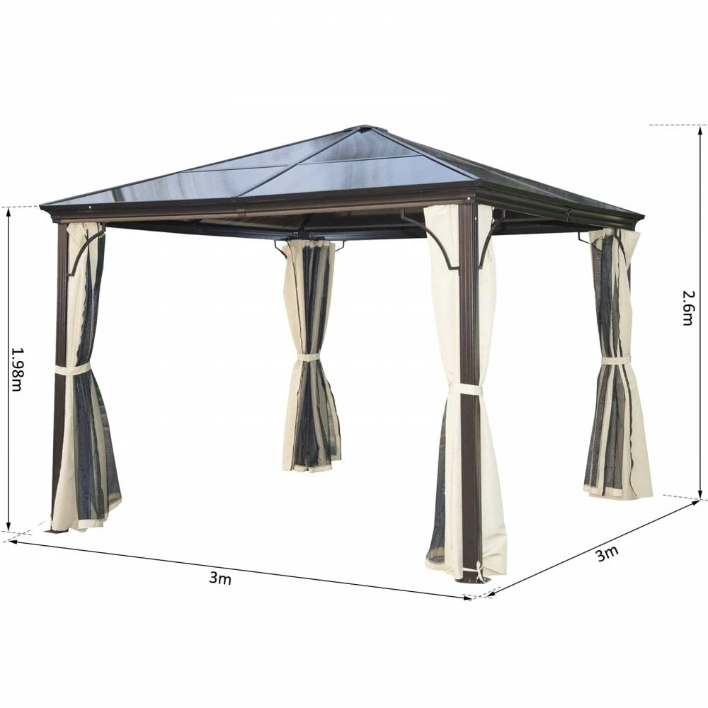 Add an elegant touch to any outdoor space with this Outsunny 3m x 3m gazebo with netting, a perfect sun shelter for any occasion! The polycarbonate roof is UV protection. Rust resistant aluminium for the frame makes it sturdy, formed into a spacious size – you can host plenty of people at once. Curtains create privacy, each with inner netting to shield you from annoying bugs and more. Life is meant to be enjoyed outdoors, so enjoy this hard roof gazebo in your own backyard space.
