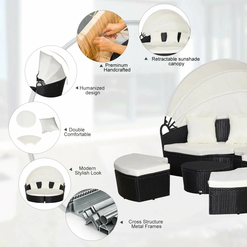 A hybrid of rattan loungers from Outsunny. The set include of two quarter round chairs, two quarter round chairs and a round table. Using metal as the base frame for a strong and sturdy structure, each piece is wrapped with PE rattan to provide a shield against light weather. Thick cushions are placed on each seat for comfort, with removable and washable covers, with a large overhead canopy completing this set to offer you protection from sun glare and wind. An innovative design to get out.