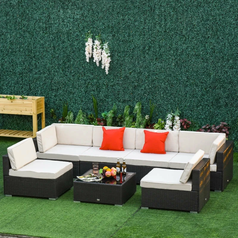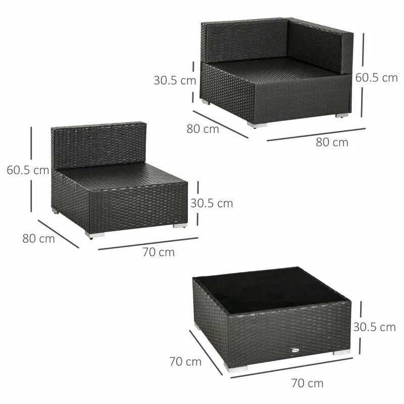 Bring beauty and comfort into your garden with this garden rattan furniture sets from Outsunny. Using steel for a stable and steady structure, each piece of the outdoor corner sofa is wrapped in PE wicker for double the durability. Padded seat and back cushions provide comfort, with two extra pillows included. The conservatory furniture is easy to assemble, with the buckle fastenings keeping all pieces secure. Set is completed with a safe tempered glass top on the table for a sleek look.
