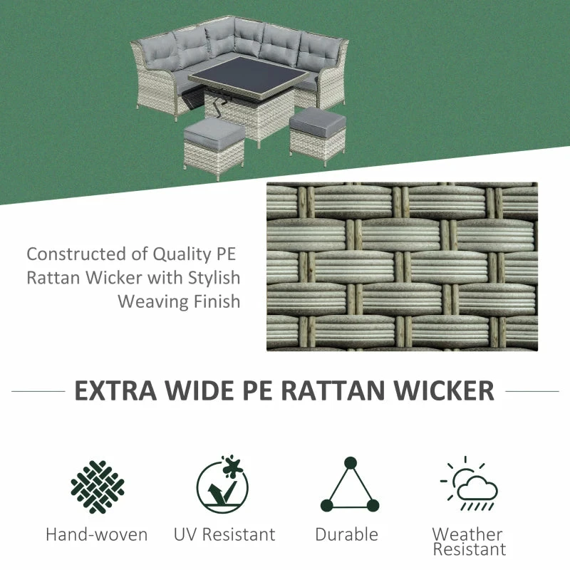 This outdoor rattan sofa set from Outsunny is best choose for your backyard. This 6 pieces rattan furniture sofa set come with two double sofa, a middle corner sofa, two footstool, and a lift able coffee table. Made of lightweight aluminium frame wrapped in extra wide PE rattan ensuring durability and protection. Thick padded filling seat and back cushions for extra comfortable. A centrepiece coffee table can raised or lowered by manual covered with a black tempered glass top for stylish.