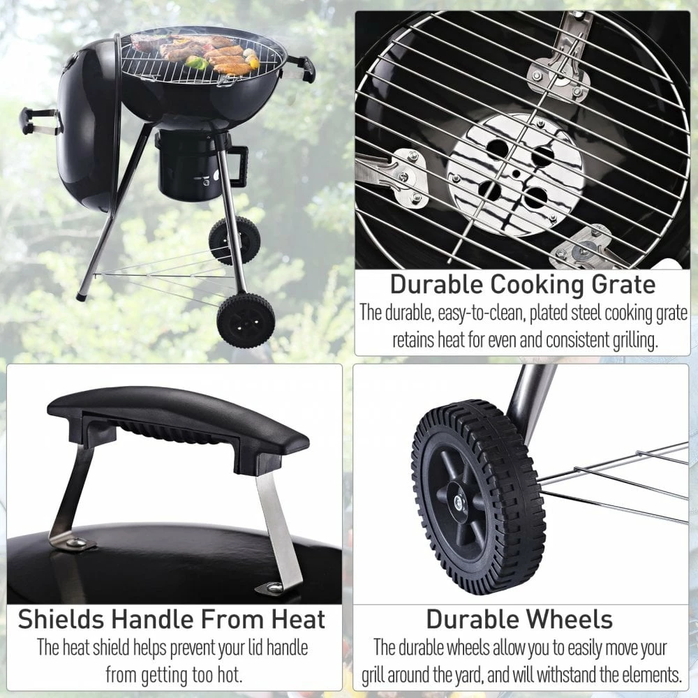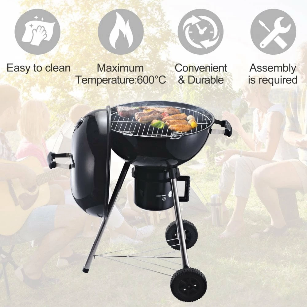 - BOTTOM CHARCOAL HOLDER: Utilises the charcoal when cooking so it is burnt fully, collecting all ash together for easy cleaning. Mesh layer to protect your food from the flames. THREE LEGS: Ensures the BBQ is kept steady and stable on the ground, with two wheels to move around easily. Small bottom shelf for storage.