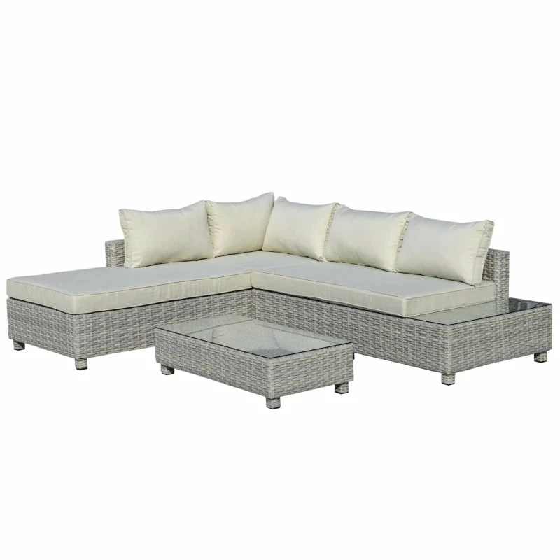 The outdoor corner sofa makes your garden attractive and let you feel relaxed in your own place. This small outdoor furniture from Outsunny is best choose for you for your backyard. This 3 pieces rattan furniture sofa set is no installation required. Made of lightweight aluminium frame wrapped in PE rattan ensuring durability and protection. Thick padded filling seat and back cushions for extra comfortable. A centrepiece tea table covered with tempered glass top for stylish.