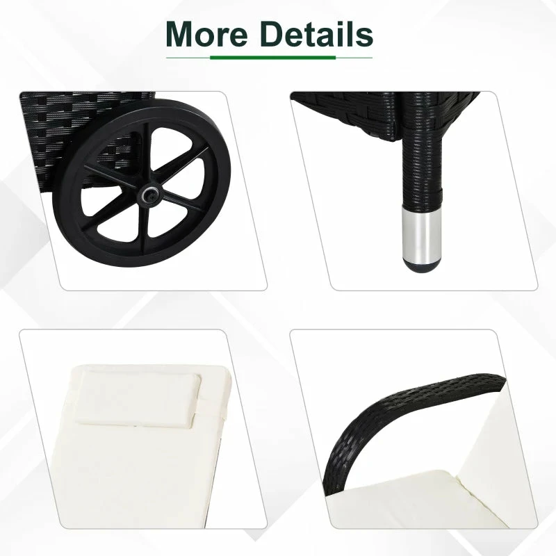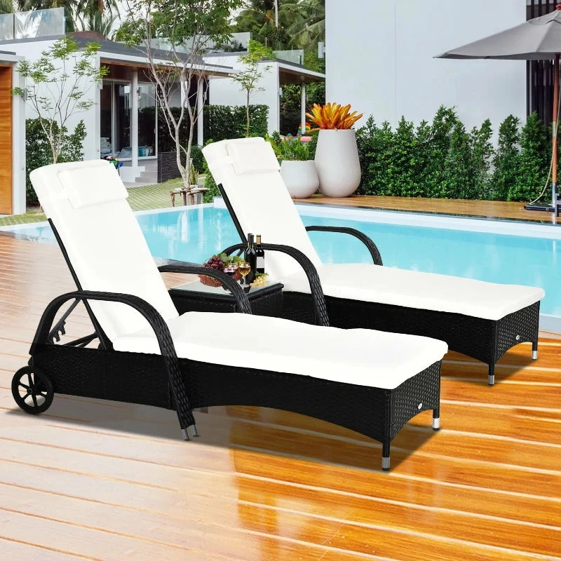 The rattan patio chaise lounge set from Outsunny comes complete with 2 loungers, 1 side table and cushions. The seat has 5 adjustable positions to give maximum relaxation and comfort. The side table also has a glass top to keep your drinks at easy reach, and the set can be used indoors and outdoors.