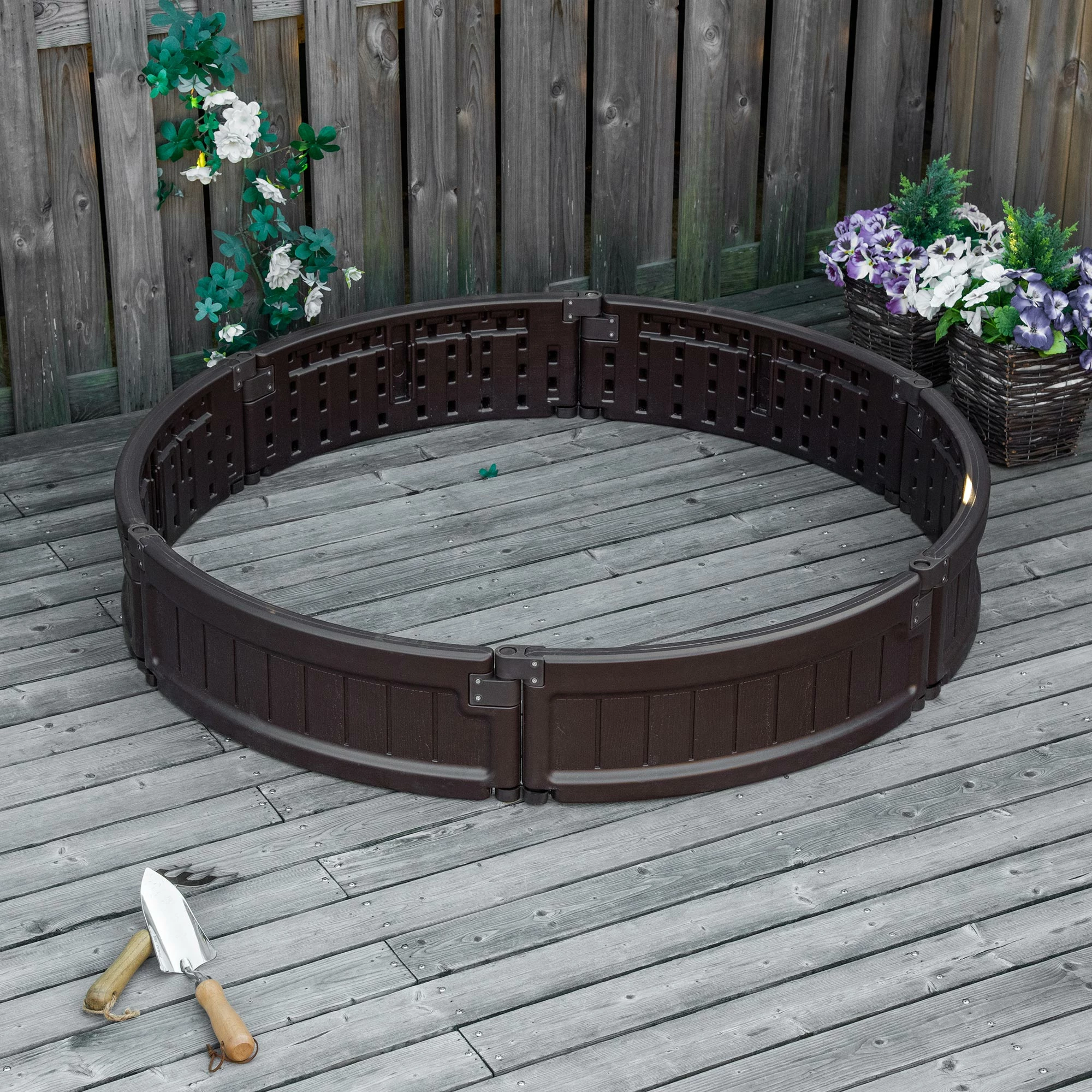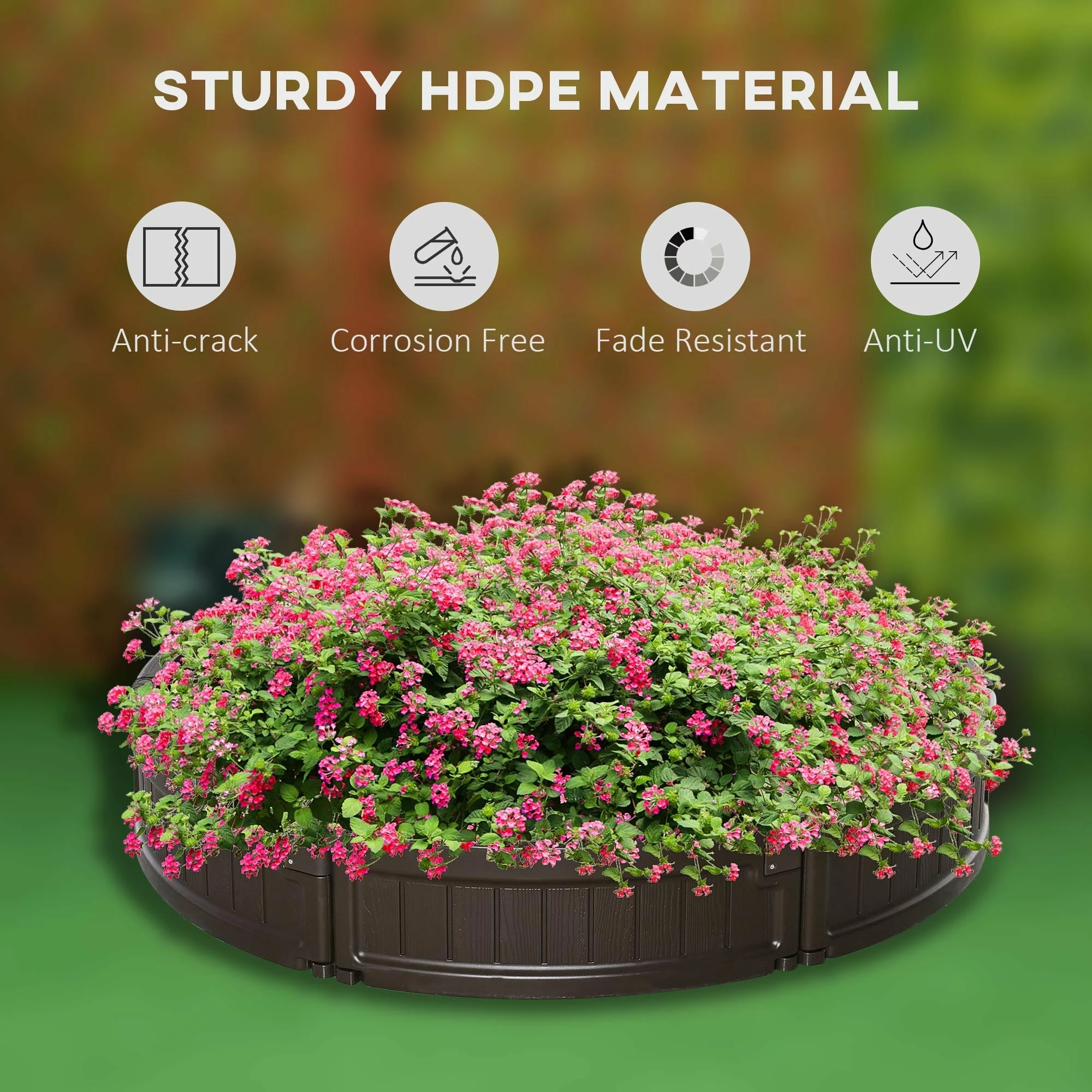 This Outsunny planter box can satisfy your desire to build a wonderful garden in your yard! The practical design of the vegetable planter makes it easy for growing your favorite flowers, fruits, herbs, veggies, or plants in just about any location. Made from high-quality HDPE material, the circular garden box is strong and durable, which can withstand years of reliable use. The surface imitation wood grain texture is beautiful and durable, making this herb garden both good-looking and useful.