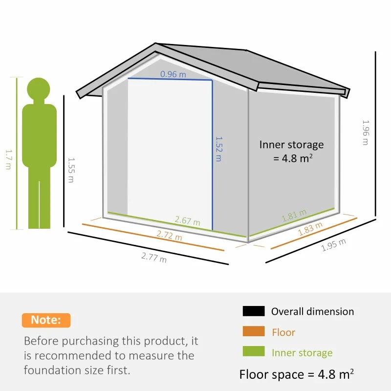 Keep your garden equipment and outdoor essentials locked away securely with metal garden sheds with base from Outsunny. It’s made from colour steel for enduring reliability. With a sloped roof sitting on the top to help prevent water stagnating and rust forming, this motorbike shed is finished with a protective weather coating and floor foundation so you have everything you need to install this large garden shed when it arrives. The perfect home for all your outdoor tools and gear.