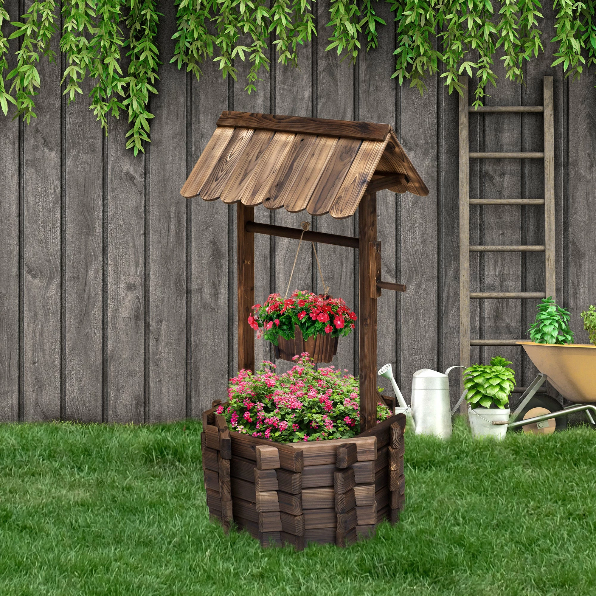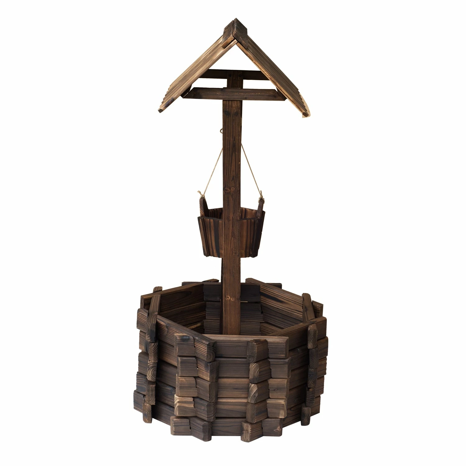 Outsunny water well planter will add an elegant and stylish look to your lawn or garden. Features burnt-like wood finish for a rustic appearance and fir wood construction keep the planter durable and long-lasting. Place various plants in the wishing well with large area and open base. The mini bucket is designed to place smaller plants and flowers at once. The garden planter features a top hut and a spacious well, which adds a fairytale accent to your garden or front yard.