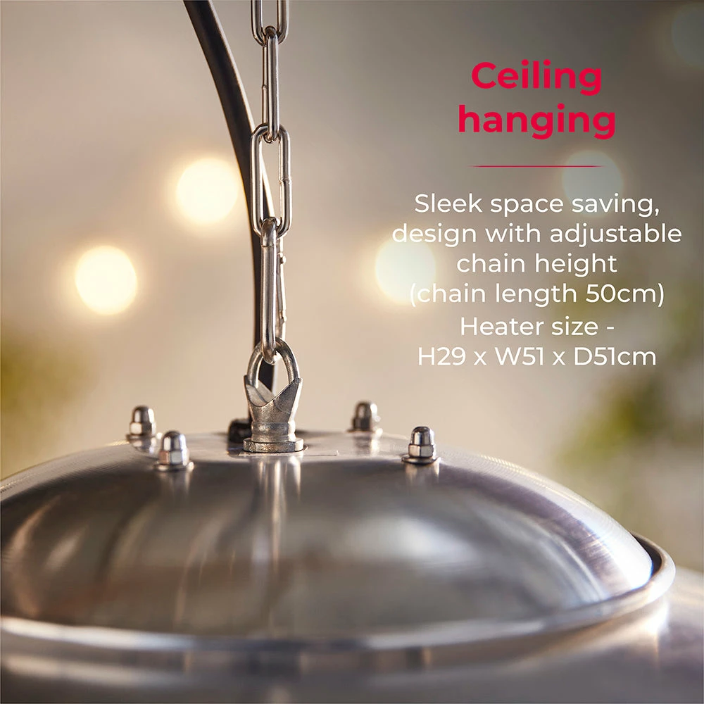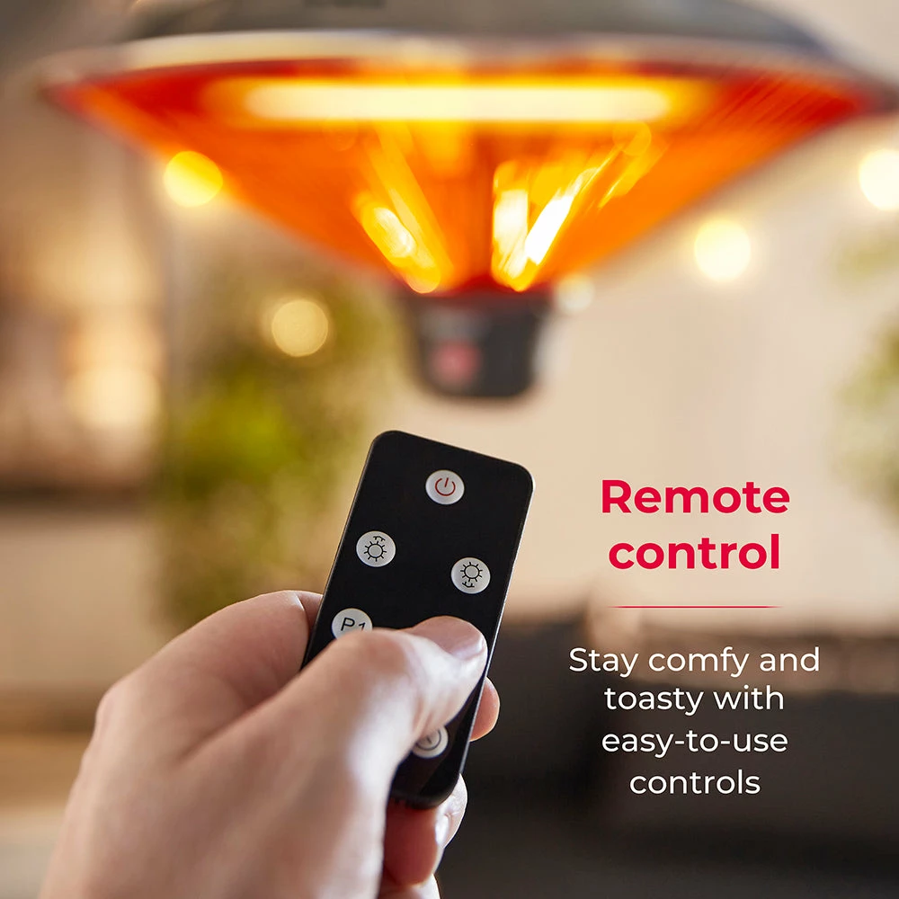 Host the perfect garden party for your friends all year round with the Tower 1500W Hanging Patio Heater. The smart halogen heat technology provides 360 heating to keep everyone warm – simply attach to the ceiling and enjoy yourself without getting cold. Using the varying power settings, you can stay cosy after a warm summers day or heat up on a chillier evening with friends. Choose from 500W, 1000W, and 1500W to achieve your desired temperature. This all-in-one heating solution combines powerful heat release with an LED light, so you can relax outdoors with friends all evening long. Easily attach to your ceiling using the 50cm chain to create the perfect ambience. With an IP34 rating, your heater will be protected come rain or shine – so you won’t need to mess about keeping it protected in different weather conditions.