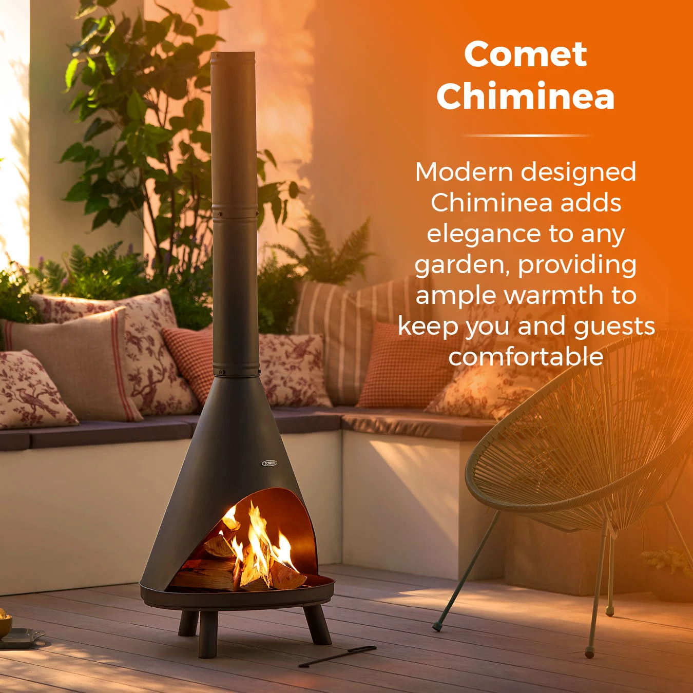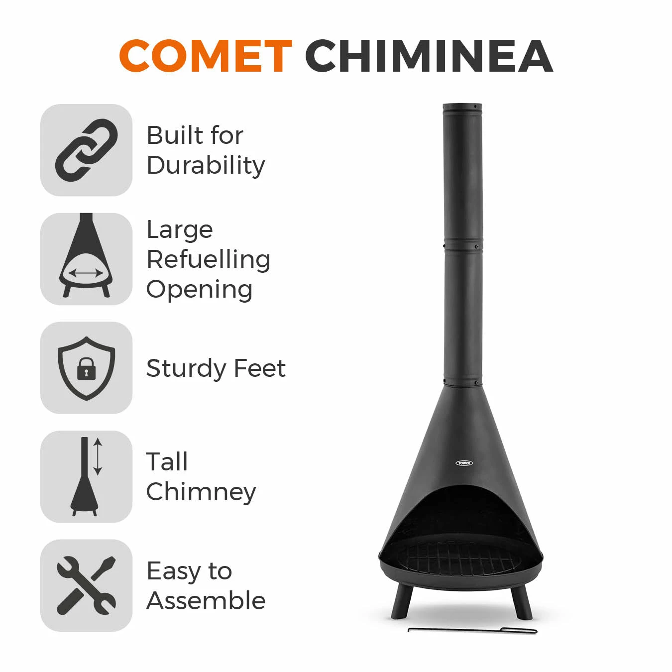 Have longer evenings spent in your garden, even when the temperature drops with Tower’s Comet Chiminea. Creating a soothing ambience for you and guests to enjoy all year round, you can all feel cosy and warm with this modern and elegant designed Chiminea, complementing any garden. Its high-grade powder coated steel body is resistant to heat, meaning it is resilient to warping and damage for continued, long-lasting use. You can easily refuel the chiminea whenever needed with the large opening, while the sturdy feet ensures the chiminea remains secure and firmly in place for added safety. The tall and sleek design of the integrated chimney directs smoke upwards, allowing it to dissipate without causing any inconvenience with a quick and easy assembly, meaning you can unbox and enjoy the chiminea in moments.