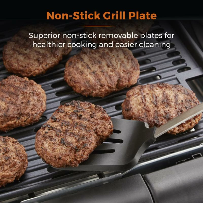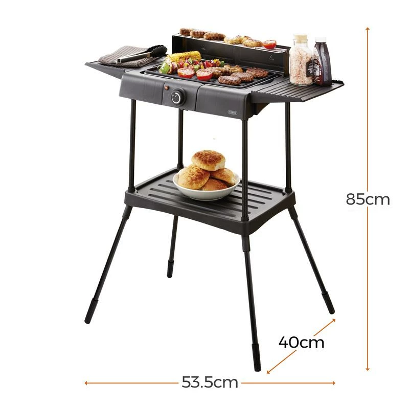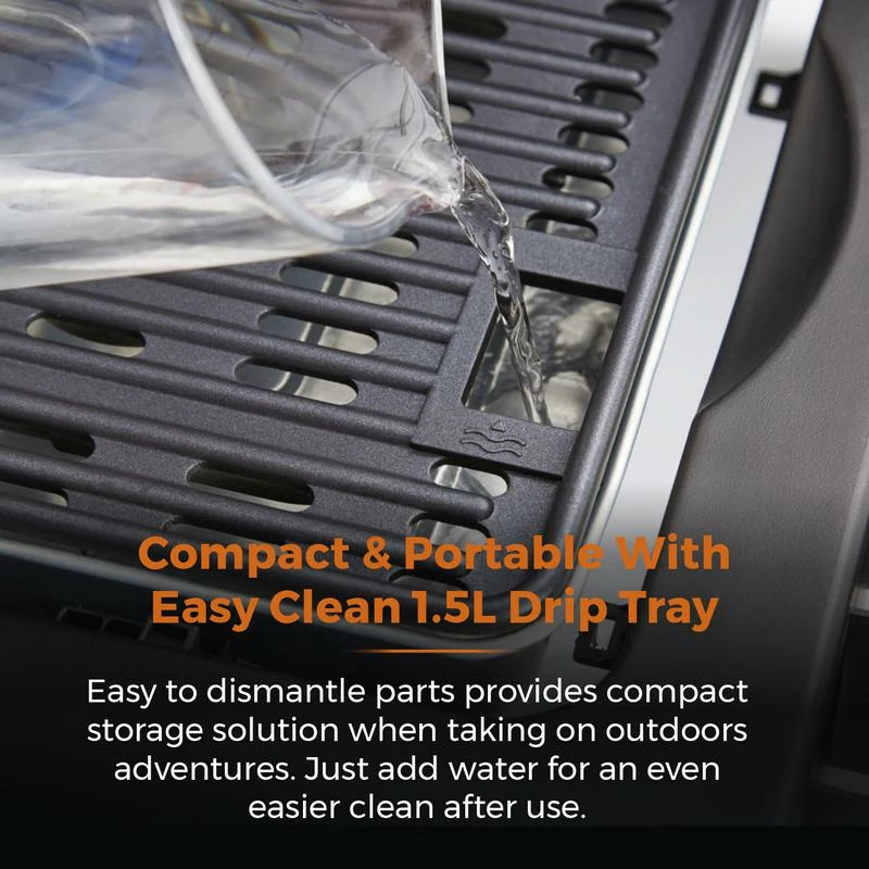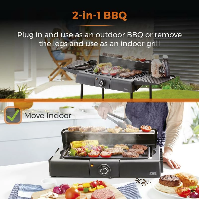 Serve up delicious healthy chargrilled chicken and crispy halloumi skewers whatever the weather with the Electric Indoor/Outdoor Health BBQ from Tower. The freestanding grill can be easily set up outdoors for garden parties, camping or caravanning, or transformed into an indoor table grill to enjoy BBQ favourites from the comfort of your dining room. The removable non-stick grill plate is ideal for healthy cooking with cut out holes allowing excess fat to drain into the water bath below easily removes food residue with a simple wipe clean. Its large 42cm x 27cm cooking surface has enough room to grill up to 8 chicken breasts or 10 burgers in one go – perfect when catering for the whole family. Simple to use controls allow you to adjust the temperature features an indicator light to alert you when the grill has reached the perfect temperature, The 1.5 litre water bath allows you to add water in order to operate safely. Afterwards, remove the tray from the BBQ, empty the water give a gentle wipe clean.